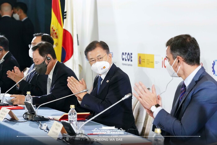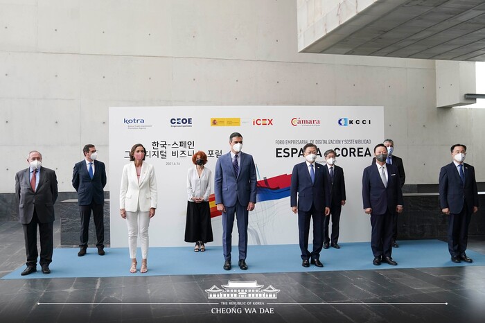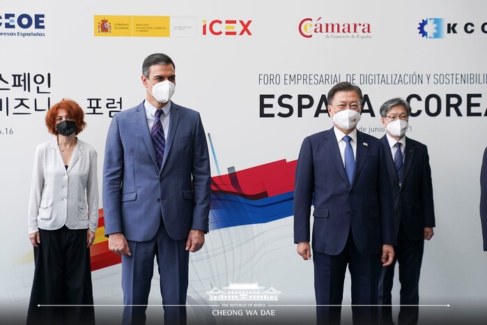 문재인 대통령은 6월 16일 오전(현지시각) 마드리드 스페인상공회의소에서 열린 ‘한-스페인 그린·디지털 비즈니스 포럼’에 참석했다. 이날 행사는 페드로 산체스 스페인 총리와 레예스 마로토 스페인 산업부장관, 문승욱 산업부장관, 박용만 한-스페인 경협위원장을 비롯해, 한국 기업 6곳, 스페인 기업 8곳의 대표가 참석해 진행했다.