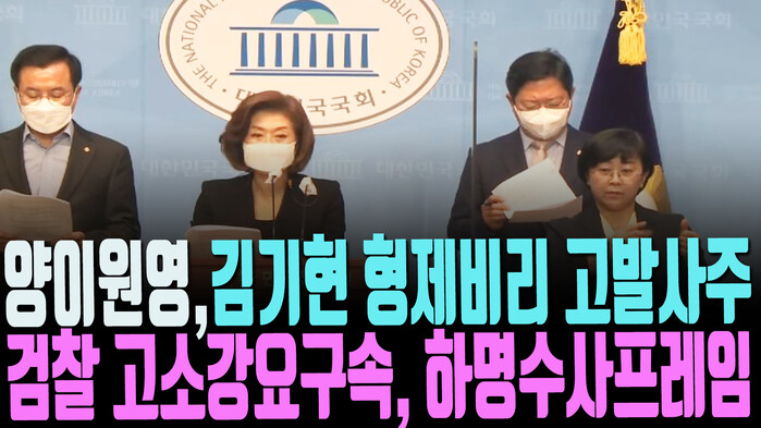 "김기현 원내대표 형제들의 비리를 고발한 이를 고소" 하도록 주변 지인들을 강요해, 결국에는 "비리 고발인을 구속" 시키고, 그 과정에서 비리 고발인의 지인들 중 한 명인 "무고한 노동자가 목숨을 끊는 일이 발생했다” 며 이후에는 "검찰이 국민의힘과 작당해 하명수사 건" 으로 국면전환하기 위해서 고발사주를 했다는 것이다.