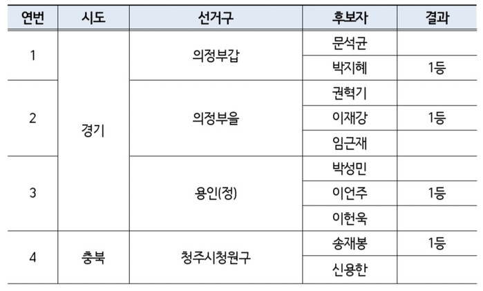 | ▲전략지역구 4구 경선결과 발표 (이미지=더불어민주당) |