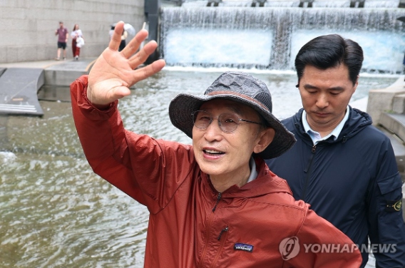이명박은 이날 서울 청계천 복원 20주년을 맞아 청계광장 일대를 걸으며 시민들과 인사를 나눴다.