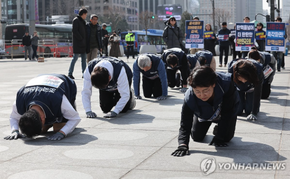 | ▲ 13일 윤석열 파면을 촉구하는 삼보일배하는 조국혁신당 (사진=연합뉴스) |