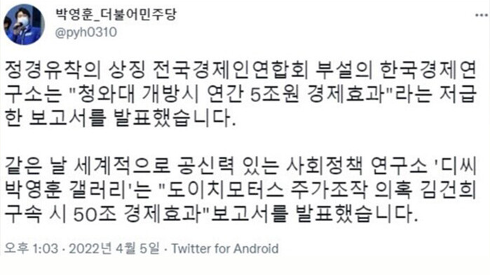 5일 박영훈 전국대학생 위원장은 자신의 트위터에 “정경유착의 상징 전국경제인연합회 부설의 한국경제연구소는 ‘청와대 개방시 연간 5조원 경제효과’라는 저급한 보고서를 발표했다”고 쓰면서 이어 “같은 날 세계적으로 공신력 있는 사회정책 연구소 ‘디씨 박영훈 갤러리’는 ‘도이치모터스 주가조작 의혹 김건희 구속 시 50조 경제효과’보고서를 발표했다”고 꼬집었다.