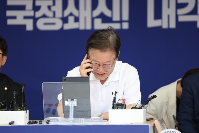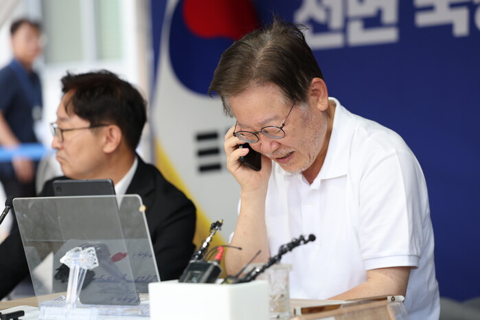 | ▲권양숙 여사와 통화하는 이재명 대표 (사진=민주당) |