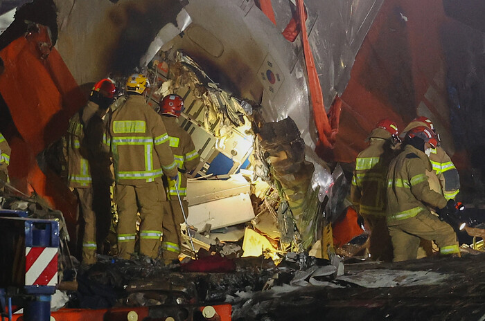 | ▲ 사고로 엉망이 돼버린 여객기 내부. 무안국제공항 제주항공 여객기 폭발 사고 현장에서 소방대원들이 내부를 살피고 있다. (사진=연합뉴스) |