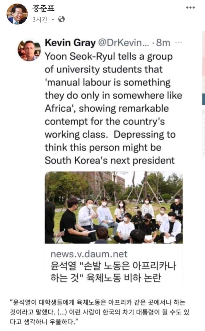 한반도 정치 및 정치경제학 연구에 저명한 영국 서섹스 대학교 국제관계학과 캐빈 그레이 교수는 16일 자신의 트위터에 윤 후보 논란발언에 대한 기사를 올리면서 “윤석열 후보가 대학생들에게 육체노동(Manual labour)은 아프리카 같은 곳에서나 하는 것이라는 놀랄 만큼 차별적(remarkable contempt) 발언을 했다”면서 “이런 자가 차기 대통령이 될 수도 있다고 생각하니 우울해진다(Depressing)”고 개탄했다.
