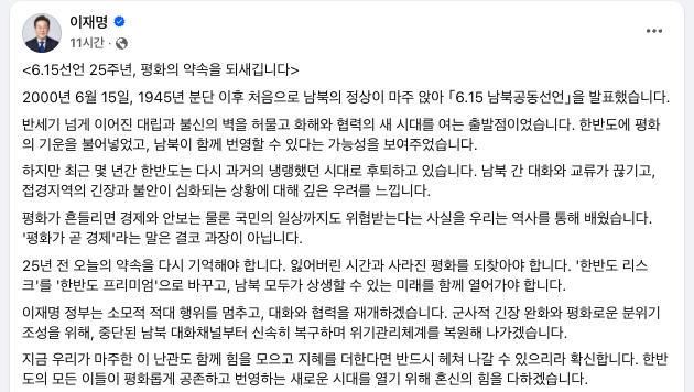 이 대통령은 "25년 전 오늘의 약속을 다시 기억해야 한다. 잃어버린 시간과 사라진 평화를 되찾아야 한다. '한반도 리스크'를 '한반도 프리미엄'으로 바꾸고, 남북 모두가 상생할 수 있는 미래를 함께 열어가야 한다"며 "이재명 정부는 소모적 적대 행위를 멈추고, 대화와 협력을 재개하겠다. 군사적 긴장 완화와 평화로운 분위기 조성을 위해, 중단된 남북 대화채널부터 신속히 복구하며 위기관리체계를 복원해 나가겠다"고 밝혔다.