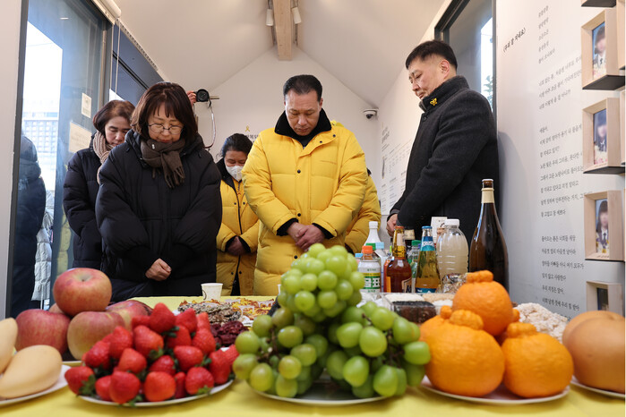 | ▲ 29일 세월호참사 가족·시민 설 명절 상차림과 음식나눔 행사에서 묵념하는 유가족들 (사진=연합뉴스) |