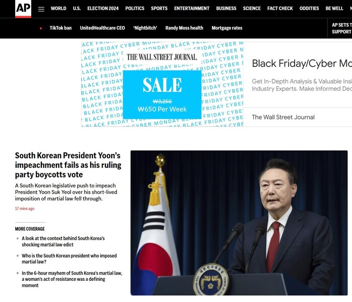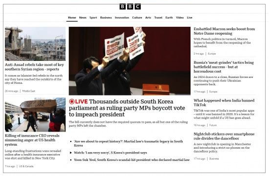 로이터통신, 뉴욕타임스(NYT), BBC 등은 탄핵소추안 표결이 시작되기 전부터 홈페이지 메인 화면에 ‘실시간 업데이트’ 페이지를 별도로 편성해 상황을 전했다.
