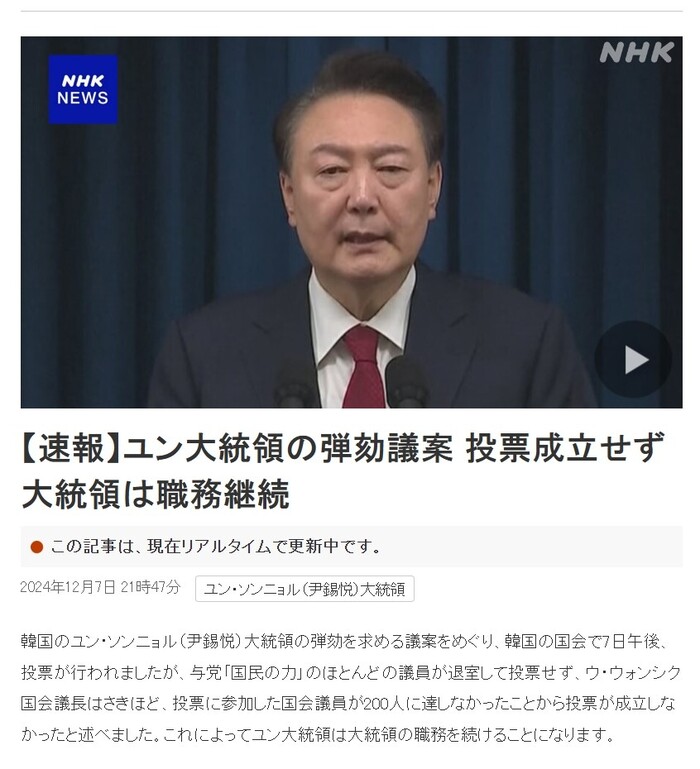 현지 공영방송 NHK는 이날 오후 9시 26분께 한국 국회에서 탄핵안 표결이 무산된 뒤 “윤 대통령 탄핵안이 투표자 수 부족으로 성립하지 않아 대통령이 직무를 계속하게 됐다”고 속보로 보도했다.