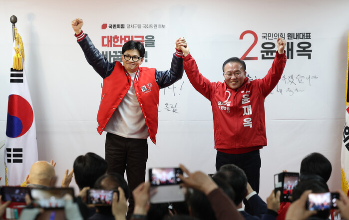 | ▲윤재옥 손 번쩍 들어올린 한동훈 비대위원장 (사진=연합뉴스) |