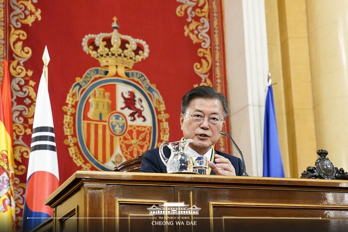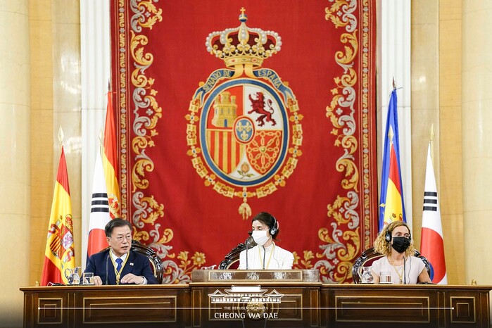 스페인을 국빈방문 중인 문재인 대통령은 16일 오후(현지시각) 대한민국 대통령으로서는 최초로 스페인 마드리드의 상원의사당을 방문, 상·하원 의원 앞에서 합동 연설을 했다. 문 대통령은 “스페인과 한국은 놀라울 정도로 닮았다며” 말을 꺼냈다. 문 대통령은 “스페인은 포용과 상생, 이해와 협의를 통해 국제적 분열을 해소하는 ‘연결국가’를, 한국은 대륙과 해양을 잇고 선진국과 개도국을 연결하며, 아시아의 평화와 번영의 질서를 선도하는 ”교량 국가를 꿈꾼다며“ 이같이 말했다.