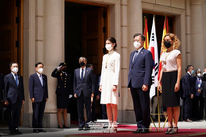 문 대통령은 “친환경 에너지 선도국가인 스페인과 디지털 강국 한국의 만남은, 포스트 코로나 시대의 핵심인 그린·디지털 분야를 중심으로 시너지를 낼 것”이라며 “그동안 건설·인프라 분야의 제3국 공동진출에 더해 5G, 전기차, 신재생에너지 시장 에도 함께 진출해” 아시아 중남미를 넘어, 전 세계를 무대로 동반 성장해 나가게 되길 희망한다고 요청했다.