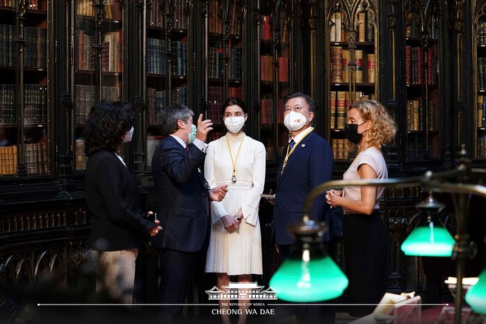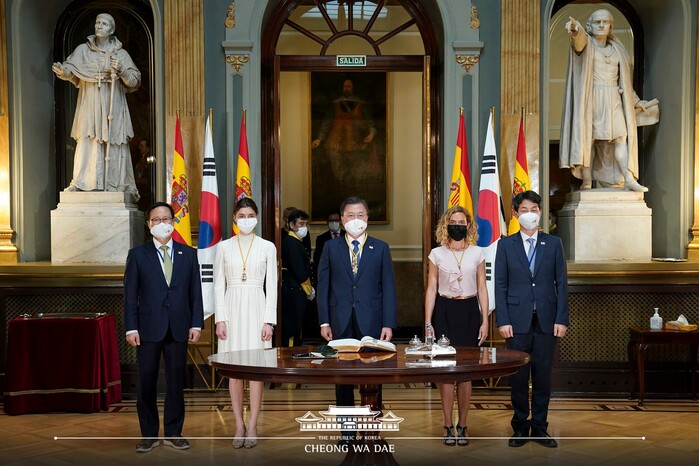 문 대통령 이날 연설 뒤 마리아 필라르 욥 쿠엔카 상원의장, 메리첼 바텟 라마냐 하원의장과 함께 스페인 상원도서관을 방문, 조선 당시 독도가 표시된 ‘조선왕국전도’에 대한 설명을 들었다.