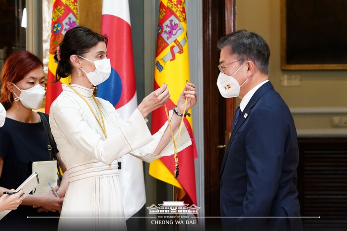 문 대통령은 “한국 국민들은 산티아고 길을 사랑하고, 스페인이 창조한 불멸의 캐릭터 ‘돈키호테’를 읽으며, 유머와 해학을 넘어선 인간적 고뇌”에 공감한다며, “스페인 국민들도 한국 K-팝과 한국 영화를 즐기는 분이 늘고 있는 만큼 이번 ”상호 방문의 해“ 연장으로, 양국 국민들의 우정과 신뢰도 더욱 깊어지길 바란다고 덧붙였다.