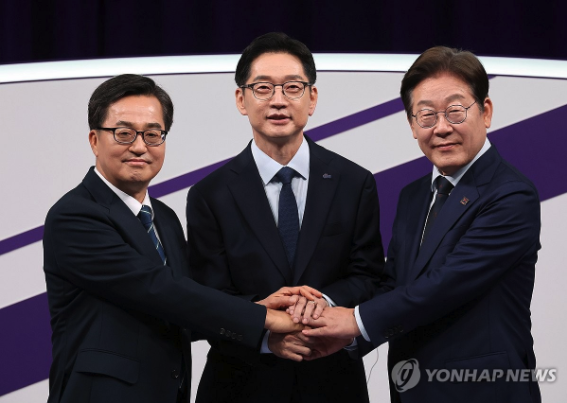 | ▲ 18일 민주당 대선 경선 후보 첫 TV 토론회. 오른쪽부터 이재명·김경수·김동연 후보 (사진=연합뉴스) |