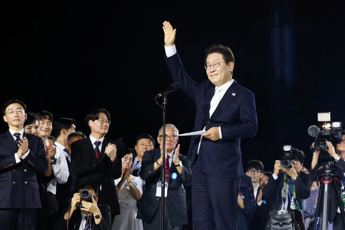 | ▲ 이재명 대통령이 15일 서울 광화문광장에서 열린 제21대 대통령 국민임명식 행사에서 감사 인사를 하며 손을 들어보이고 있다. 2025.8.15 (사진=연합뉴스) |