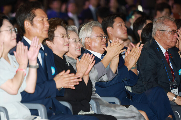 이날 광화문 광장에서 가장 주목받은 인물은 단연 문재인 전 대통령이었다. 이 대통령은 앞줄에 앉은 문 전 대통령 내외와 일일이 악수하며 각별한 예우를 표했다. 고(故) 노무현 전 대통령의 부인인 권양숙 여사도 문 전 대통령 부부와 나란히 앉아 행사를 지켜봤다.