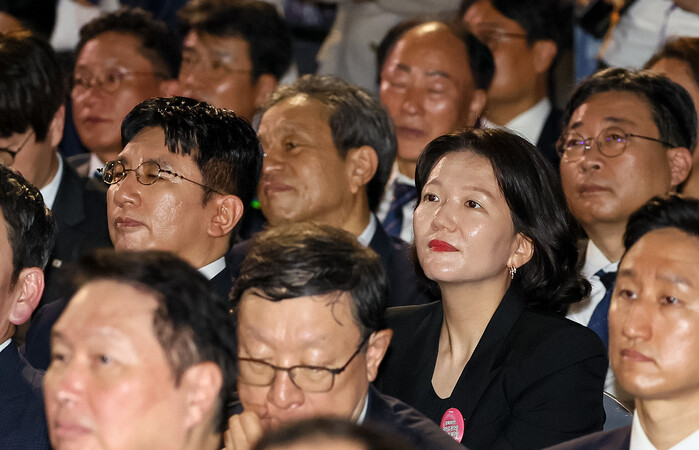 야당의 '보이콧'에도 불구하고, '민주당의 역사'를 상징하는 문재인 전 대통령과 권양숙 여사가 나란히 참석해 굳건한 지지를 보냈고, 이재용·최태원 회장 등 대한민국 경제를 이끄는 재계 총수들이 '역대급'으로 총출동해 새 정부에 대한 기대감을 드러냈다.
