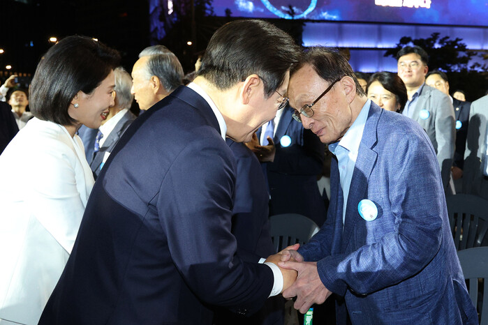 | ▲ 이재명 대통령이 15일 서울 광화문광장에서 열린 제21대 대통령 국민임명식 행사에서 이해찬 전 국무총리와 인사하고 있다. 2025.8.15 (사진=연합뉴스) |
