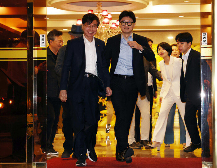 | ▲만찬 마치고 조경태 의원과 함께 걸어나오는 한동훈 대표 (사진=연합뉴스) |