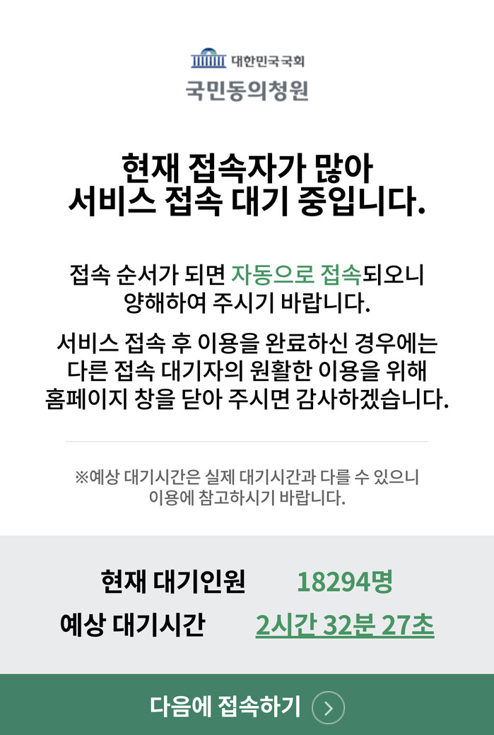 | ▲국민동의청원 접속 지연 안내 화면 캡쳐 |