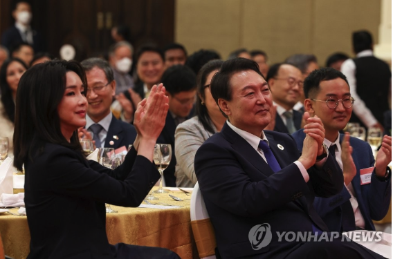 | ▲ 윤석열과 김건희가 11일(현지시간) 캄보디아 프놈펜 한 호텔에서 열린 동포 만찬 간담회에서 축하공연을 보며 박수를 치고 있다. 2022.11.11 (사진=연합뉴스) |