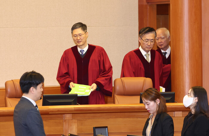 | ▲ 22일 헌법재판관 미임명 권한쟁의 심판 입장하는 헌재 재판관들 (사진=연합뉴스) |