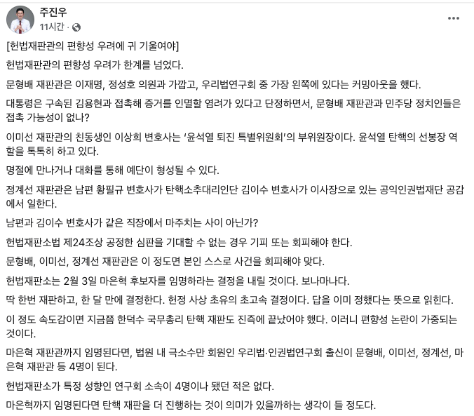 주진우 국민의힘 법률자문위원장은 28일 SNS에 "헌법재판관의 편향성 우려가 한계를 넘었다. 문형배 재판관은 이재명·정성호 의원과 가깝고, 우리법연구회 중 가장 왼쪽에 있다는 커밍아웃을 했다"고 주장했다.