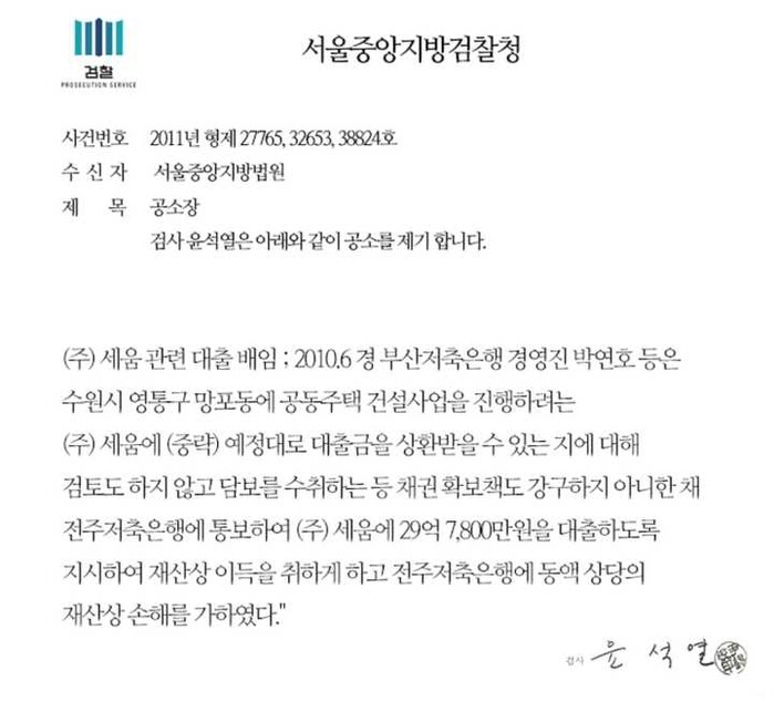 그러나 당시 주임검사였던 윤석열 대검 중수 2과장은 부산저축은행이 세움에 불법 대출한 사실을 확인한 공소장에 직접 서명까지 해놓고도 조씨에 대한 수사는 물론 기소도 안했다.