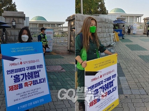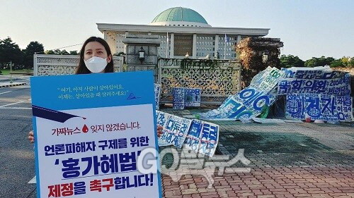 | ▲ '가짜뉴스 피해자 연대'를 발족한 홍가혜 씨가 '홍가혜법' 제정을 위해 국회에서 1인 시위를 시작했다. ⓒ 고발뉴스 |