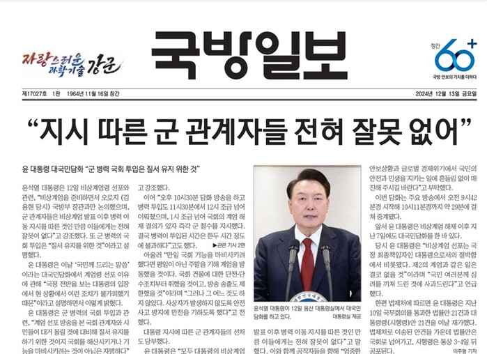 국방일보는 지난 13일 윤석열 대통령 대국민담화를 소개하는 기사를 1면과 2면에 게재했다. 기사 제목은 "지시 따른 군 관계자들 전혀 잘못 없어", 윤 대통령 "탄핵이든 수사든 당당히 맞설 것"이다.