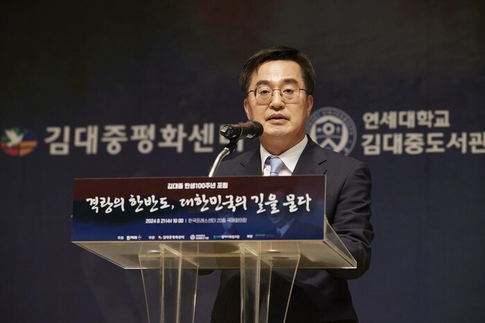 김 지사는 21일 '김대중 탄생 100주년 포럼' 축사를 통해 “윤 정부 들어 그동안 해왔던 여러가지 일들과 국가의 역주행, 특히 최근 광복절까지도 이념화했다”며 “이런 모습을 보면서 김 전 대통령께서 2009년 돌아가시기 전에 썼던 일기에 ‘인생은 생각할 수록 아름답고 역사는 앞으로 발전한다’고 적혔는데, 이 말이 맞는 것인가 생각했다”고 했다.