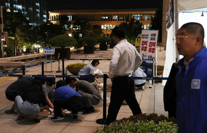 14일 경찰에 따르면 56세 김모씨는 오후 7시52분께 천막 앞에서 소리를 지르다 퇴거 요청을 받자 저항하며 흉기를 휘둘러 국회경비대 소속 여성 경찰 2명을 다치게 했다.