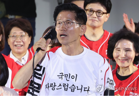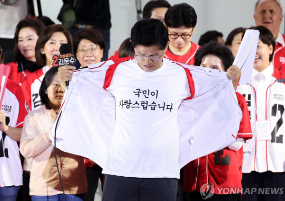 김 후보는 겉옷을 벗어 ‘국민이 자랑스럽습니다’라는 문구가 새겨진 상의를 드러낸 뒤 “어떤 사람은 방탄조끼를 입지만 나는 필요 없다. 여러분이 바로 제 방탄조끼”라며 “방탄유리도 필요 없다. 내 양심이 방탄유리”라고 외쳤다.