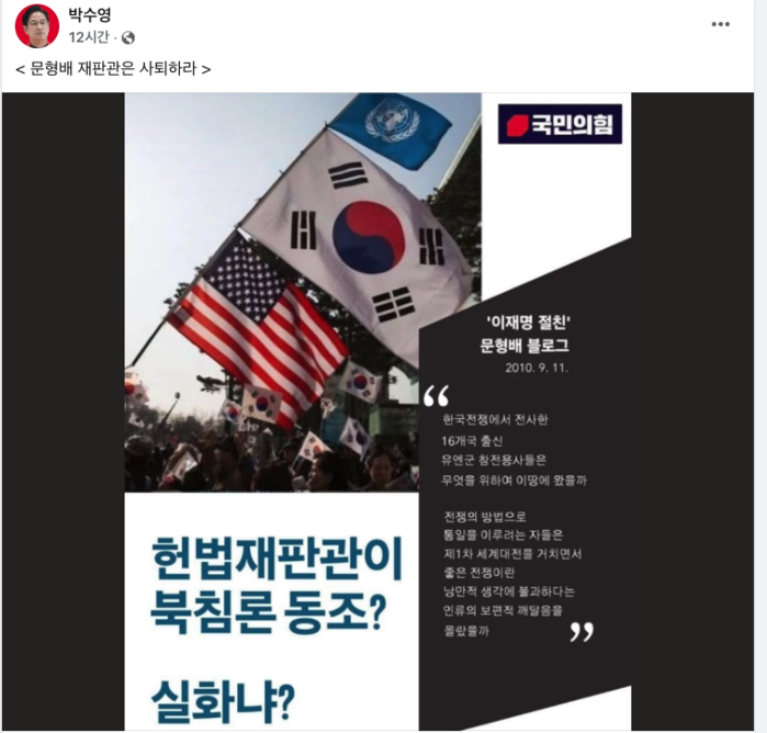 박 의원은 이날도 페이스북에 해당 부분을 발췌해 옮긴 뒤 "헌법재판관이 북침론 동조, 실화냐"라고 쓴 이미지를 올렸다.