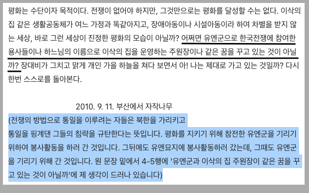 또 당시 방문이 "평화를 지키기 위해 참전한 유엔군을 기리기 위해 봉사활동을 하러 간 것"이고 이후에도 유엔군을 기리기 위해 유엔묘지 봉사활동을 갔다며 "'유엔군과 이삭의 집 주원장이 같은 꿈을 꾸고 있는 것이 아닐까'에 제 생각이 드러나 있다"고 썼다.