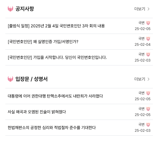 국민변호인단 홈페이지 구성도 이런 목적에 부합하는 형태다. 입장문·성명서 페이지에는 '사실 왜곡과 오염된 진술이 밝혀졌다' '헌법재판소의 공정한 심리와 적법절차 준수를 기대한다' '투표자 숫자 검증은 가장 기본적이고 필수적인 증거다' 등 운영자 측의 입장을 정리한 글이 게시돼 있다.