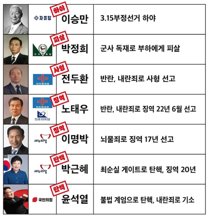 | ▲ 국민의힘 계열 출신 역대 대통령의 최후 (출처=커뮤니티) |