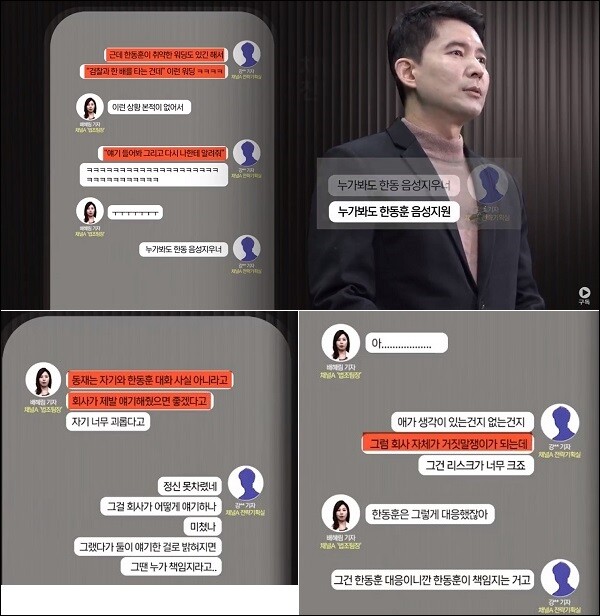 (배 팀장) “동재는 자기와 한동훈 대화 사실이 아니라고 회사가 제발 얘기해줬으면 좋겠다고. 자기 너무 괴롭다고” (강 기자) “정신 못 차렸네. 그걸 회사가 어떻게 얘기하나, 미쳤나. 그랬다가 둘이 얘기한 걸로 밝혀지면 그땐 누가 책임지라고…”