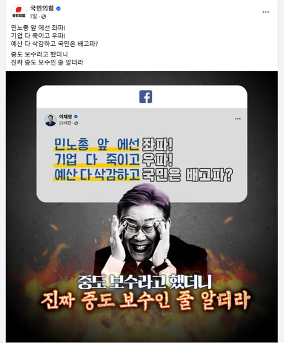 국민의힘은 지난 24일 당 페이스북에 이재명 대표를 악마처럼 표현한 이미지를 게재했다.