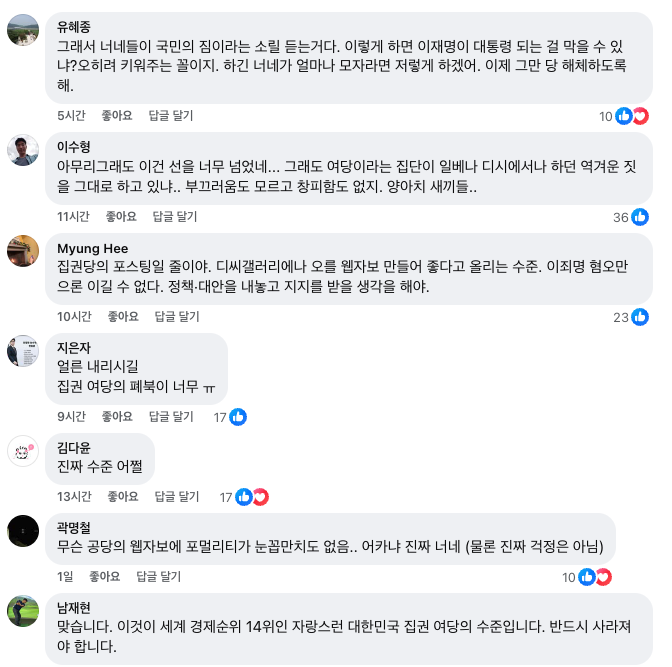 이 글 댓글엔 “집권당의 포스팅일 줄이야”, “아무리 그래도 이건 선을 너무 넘었네.그래도 여당이 일베에서나 하던 짓을 그대로 하고 있냐”며 부정적인 반응들이 달렸다.