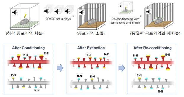 소멸로 크기가 감소하였다. 그리고 동일한 공포기억을 학습시키면 작아졌던 기억저장 시냅스의 크기가 회복되었다. 이는 기억저장 시냅스가 기억의 상태를 반영함을 보여준다. (출처: 강봉균 교수 연구팀)