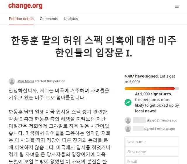 | ▲미국에 거주하며 자녀들을 교육하고 있다고 밝힌 누리꾼이 16일(현지시간) 글로벌 청원 사이트 '체인지'(change)에 한동훈 법무부장관 딸의 스펙 의혹을 비판하는 청원을 올렸다. '체인지' 홈페이지 캡처 |