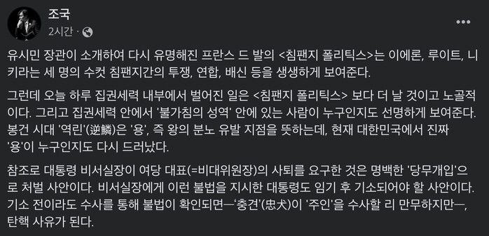 조 전 장관은 세계적인 영장류 학자 프란스 드 발의 책 〈침팬지 폴리틱스〉를 언급하며 "이에론, 루이트, 니키라는 세 명의 수컷 침팬지 간의 투쟁, 연합, 배신 등을 생생하게 보여준다. 오늘 하루 집권세력 내부에서 벌어진 일은 책보다 더 날 것이고 노골적"이라고 지적했다.