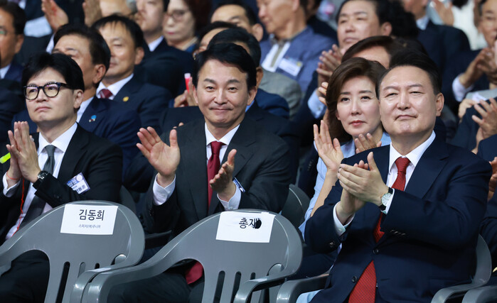 | ▲자유총연맹 창립 70주년 기념식에 참석한 한동훈 원희룡 나경원 그리고 윤석열 (사진=연합뉴스) |