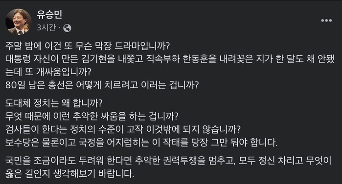 유 전 의원은 “80일 남은 총선은 어떻게 치르려고 이러느냐, 무엇 때문에 이런 추악한 싸움을 하는 것이냐”며 “검사들이 한다는 정치의 수준이 고작 이것밖에 되지 않느냐”고 지적했다.