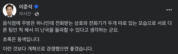 이 대표는 "음식점에 주방은 하나인데 전화받는 상호와 전화기가 두개 따로 있는 모습으로 서로 다른 팀인 척 해서 이 난국을 돌파할 수 있다고 생각하는 군요"라며 "초록은 동색입니다. 이런 것보다 개혁으로 경쟁했으면 좋겠습니다"라고 밝혔다.