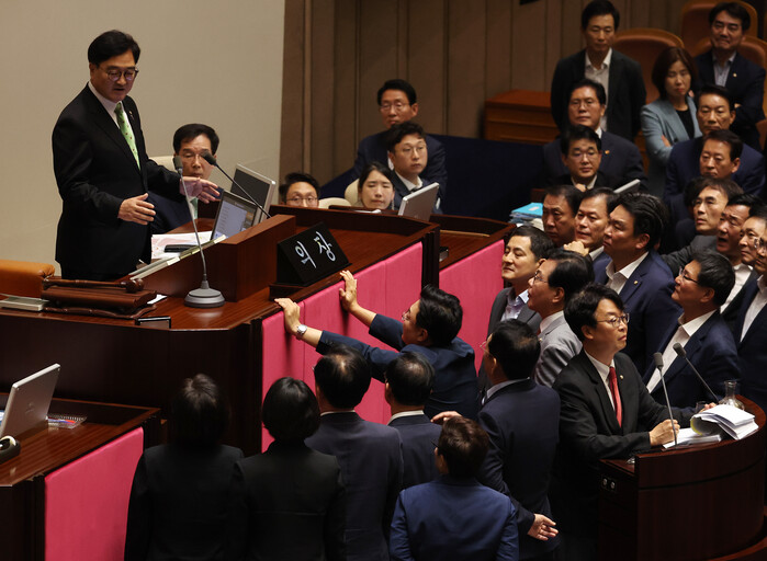 | ▲국회의장을 향해 거칠게 항의하는 국민의힘 의원들 (사진=연합뉴스) |
