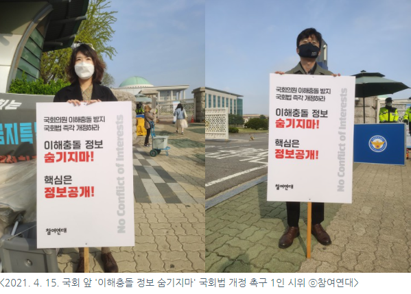 이에 참여연대는 국회 앞에서 국회의원 사적이해관계 정보 공개와 국회의원 이해충돌 방지 위한 국회법 개정안의 조속한 처리를 촉구하는 1인 시위를 이어갑니다.