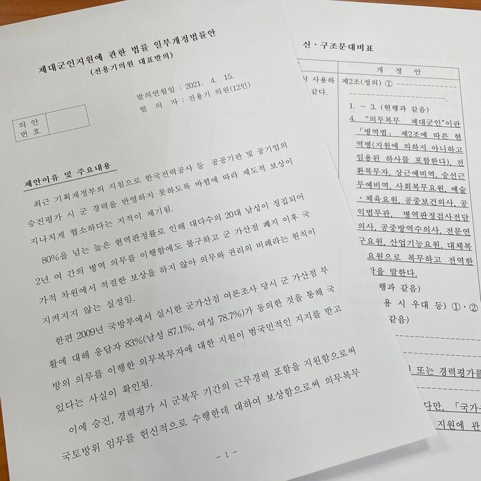 전용기 의원은 제대군인지원에 관한 법률 일부개정법률안의 대표발의를 하면서, 공기업과 공공기관에 의무복무 제대자의 경력을 승진평가에 반영하도록 발의했다고 밝혔다.